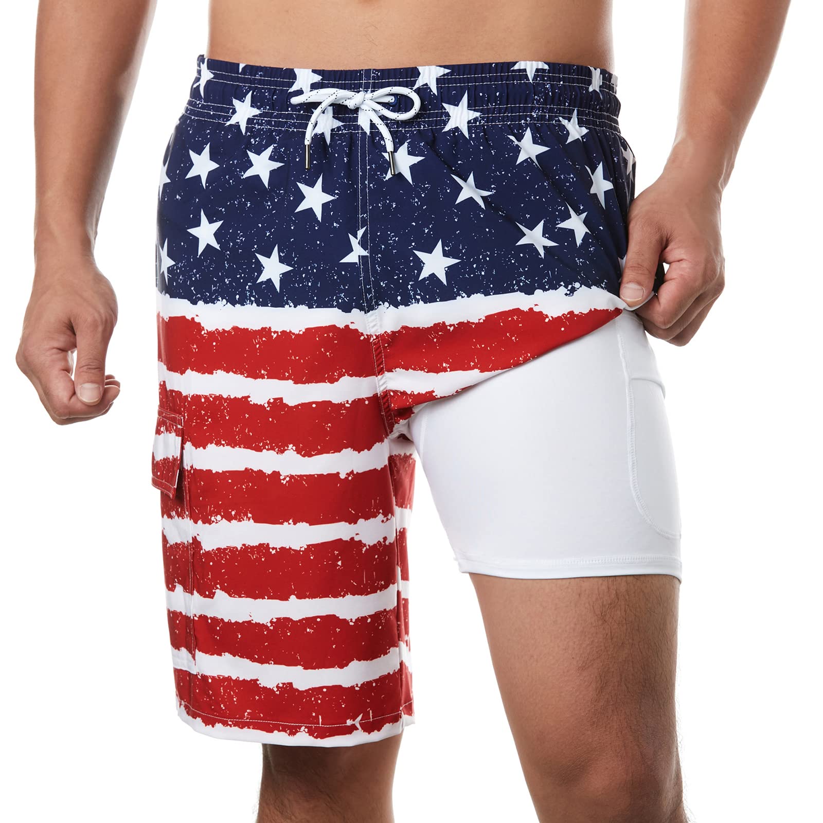 [Large Cargo Pocket shorts]: Beach shorts has phone pocket on the compression liner without mesh netting, also a large cargo pocket is designed for your convenience.It‘s the perfect gifts for your guys.